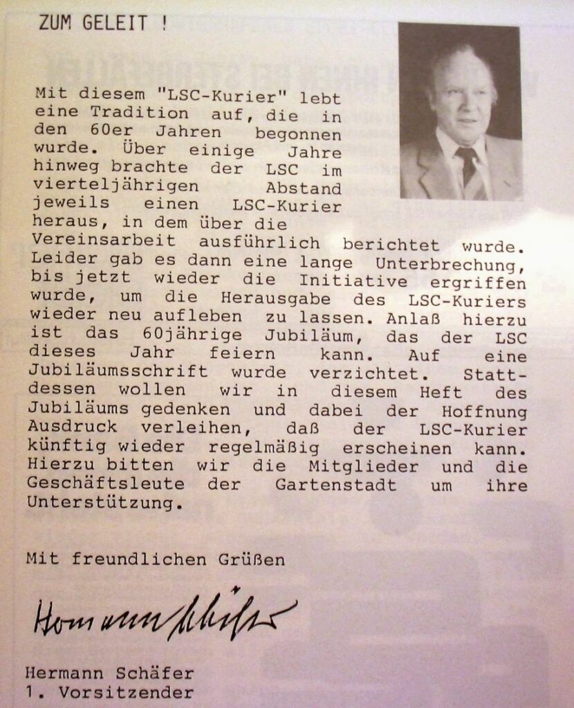 Leider konnte Hermann Schäfer die Feier zum 60-jährigen Jubiläum des LSC am Samstag, 19. Oktober 1985 nicht mehr miterleben – Ein großes LSC-Herz schlug nicht mehr….